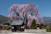 本堂や観音堂の中庭に咲き、天蓋のように境内を包み込む見事な樹形。樹齢270年。