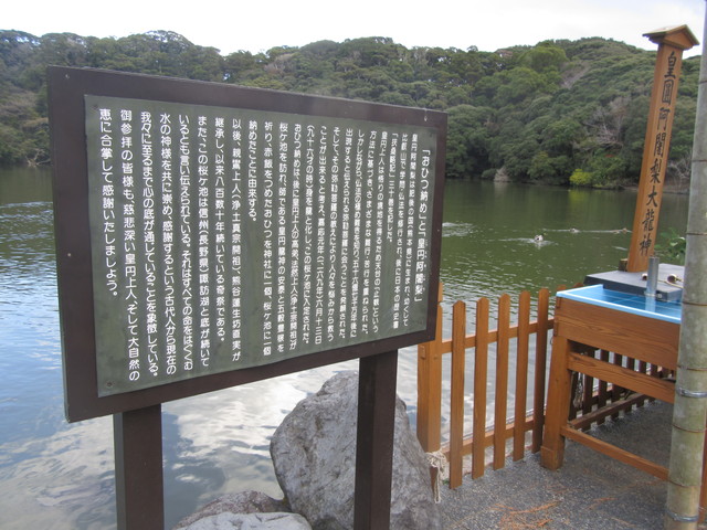 今から約850年前、1169年に世の人々を救うため、比叡山の名僧・皇円阿闍梨は龍神に姿となり桜ヶ池の底深く沈み、56億7千万年後に出現するという弥勒菩薩を待つという。