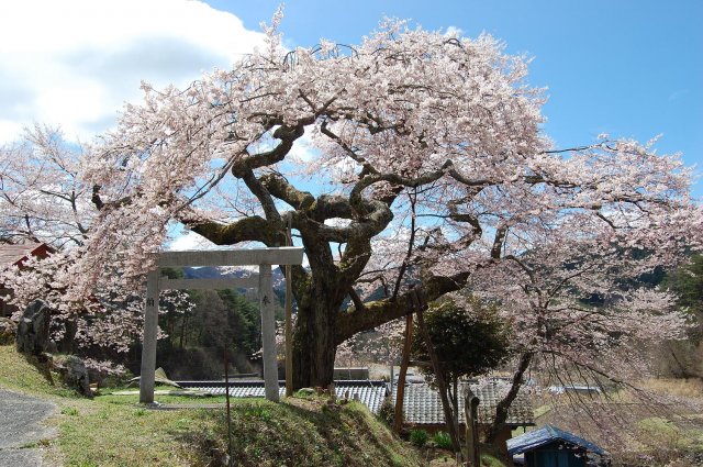 旧遠州街道を覆うように枝が伸び、南信州一樹形が美しいともいわれる樹齢350年の桜